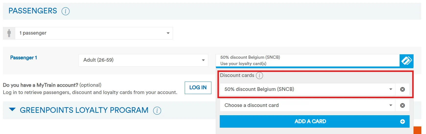 The SNCB sells tickets online with a FIP 50 discount. Simply select the discount “50% Discount Belgium (SNCB)” for the travelers. Multiple discounts can also be specified here, e.g., a simultaneously valid FIP Coupons for CFL (Luxembourg) or NS (Netherlands).